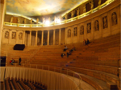 これが劇場の客席。客席部分は木、壁は石。天井には青空が描かれている