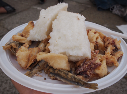 昼食は名物のFritto misto di mare(魚介類のフリット)のポレンタ(とうもろこしの粉を練って煮たもの)添え。